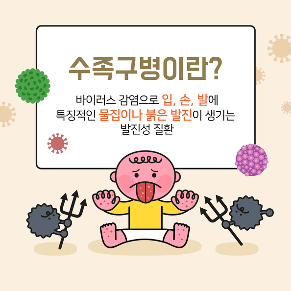 수족구병은 주로 콕사키바이러스나 엔테로바이러스에 의해 발생하는 감염병입니다. 이름처럼 손(手), 발(足), 입(口)에 수포가 생기며 통증을 동반합니다. 보통 5세 이하 유아에서 흔히 발생하고, 전염력이 매우 강해 집단생활을 하는 환경에서 쉽게 퍼집니다.