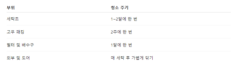 청소 범위는 세탁조, 고무 패킹, 배수구, 외부 패널 등이며, 내부 분해를 통한 완전 청소도 가능해 1년에 한 번 정도 이용하면 위생 관리에 도움이 됩니다.