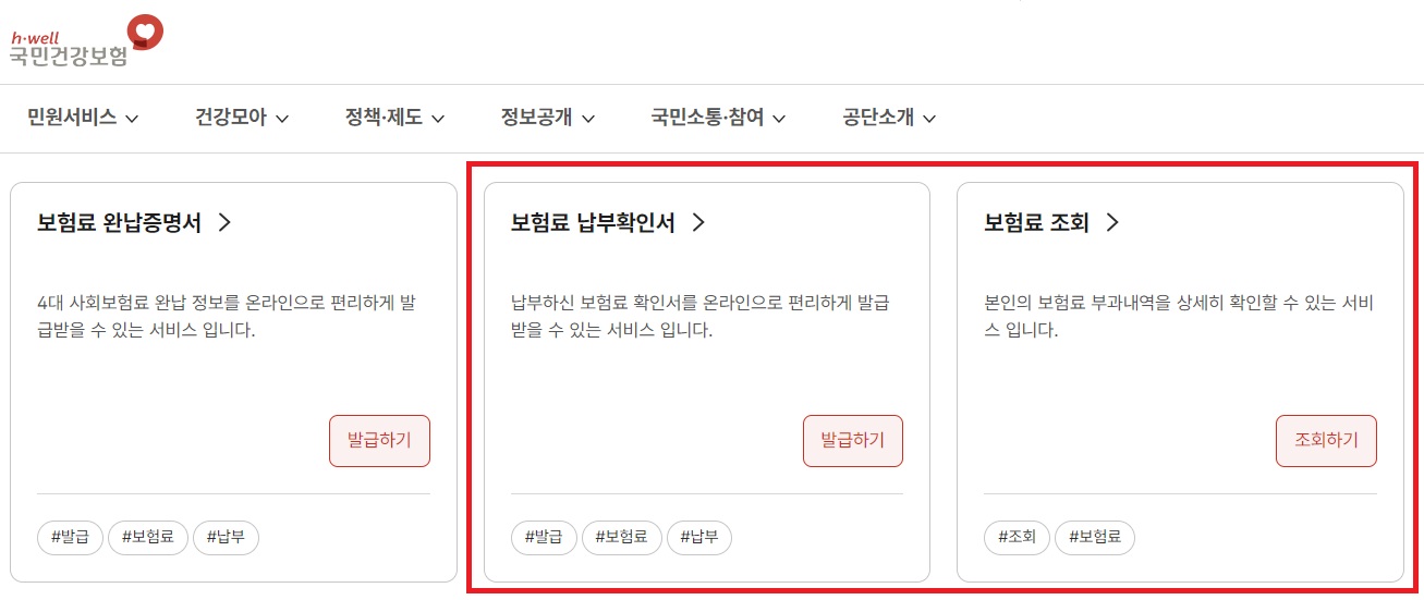 - 국민건강보험공단 홈페이지 → ‘민원신청’ → ‘보험료 납부확인서’ → 프린트 또는 PDF 다운로드